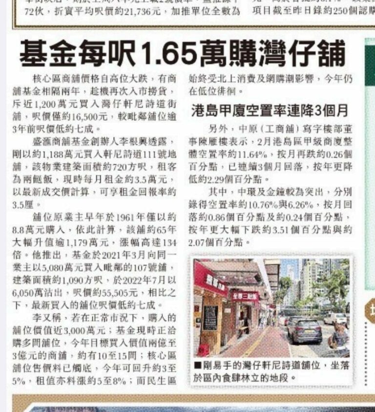 今年基金目標買入約8億至10億元街舖,約有40至50間,每間約2,000萬至3,000萬元,當中六成為核心區舖,四成民生區舖位。